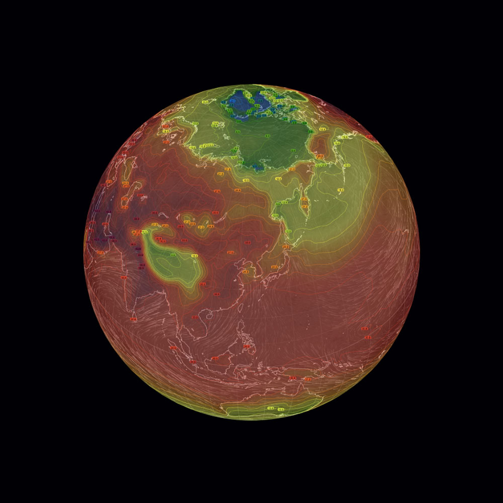 ▲ 국립기상과학원이 예측한 2100년 7월 지구의 모습. 지구 전체가 사실상 붉은 색의 높은 기온을 나타내고 있다. 이에 따르면 북극도 영상권이 돼 빙하는 모두 녹는다.(기사 중 국립기상과학원 자료 재인용)