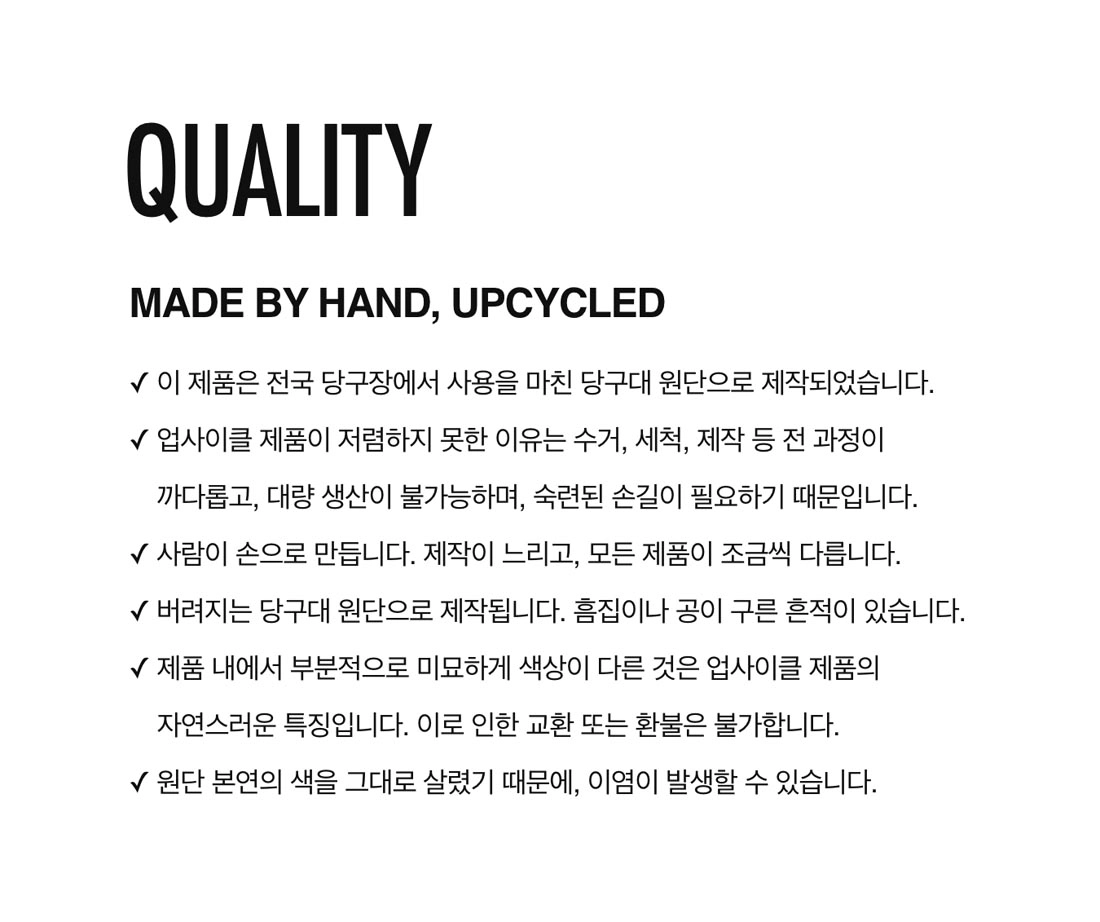 • 상세 이미지로는 업사이클 제품의 특성, 컨디션을 완벽하게 표현하지 못할 수 있습니다.