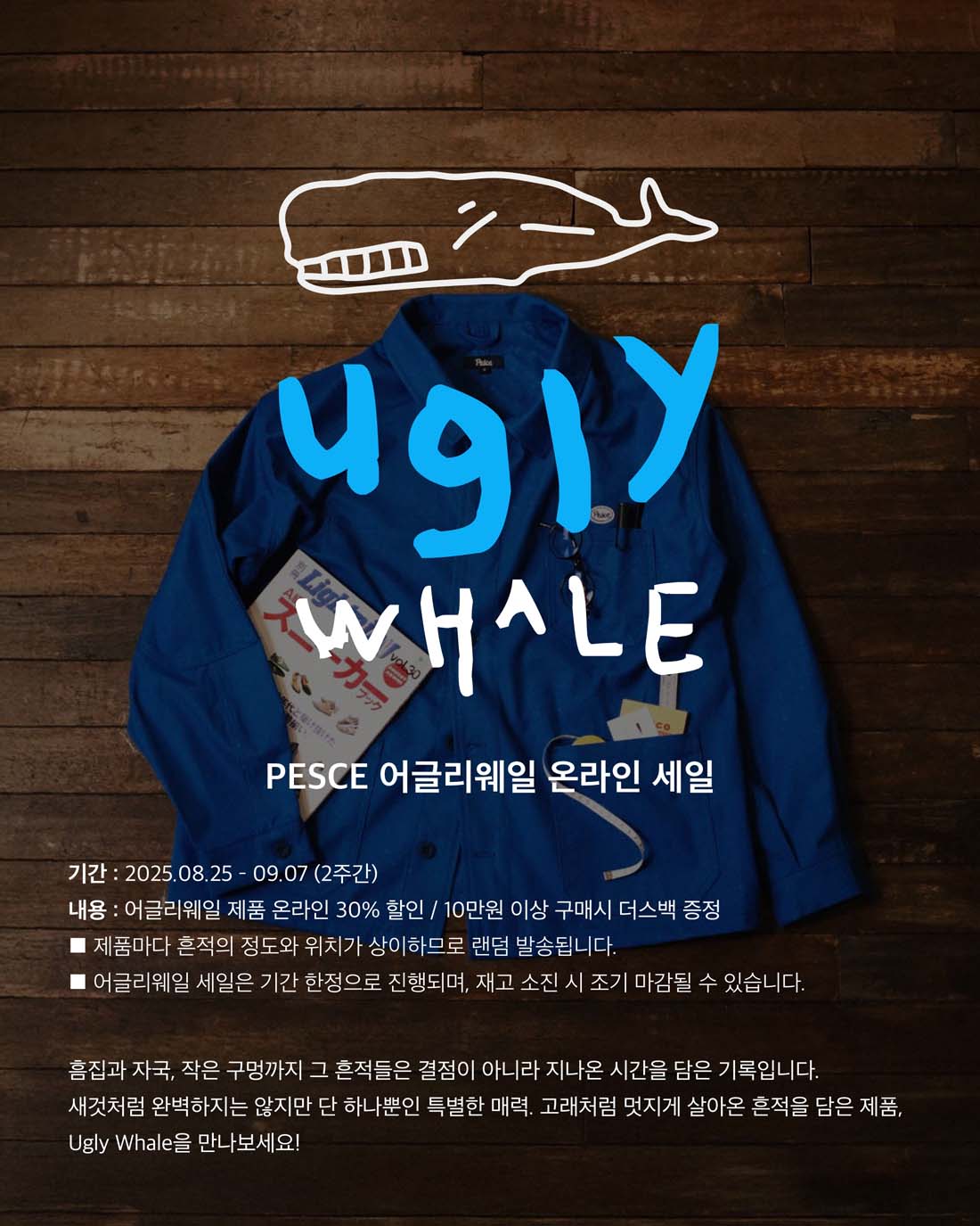 Ugly Whale 세일은 페셰의 비정기적 할인 행사입니다. 여기엔 ‘작은 흠’이 있는 제품들이 포함되어 있어요. 구매 전, 이 ‘흔적’이 어떤 것인지 알고 계시는 게 좋아요. 꼭 한 번 확인해 주세요. 아래 버튼을 눌러 Ugly Whale 제품에 대해 더 알아보세요.